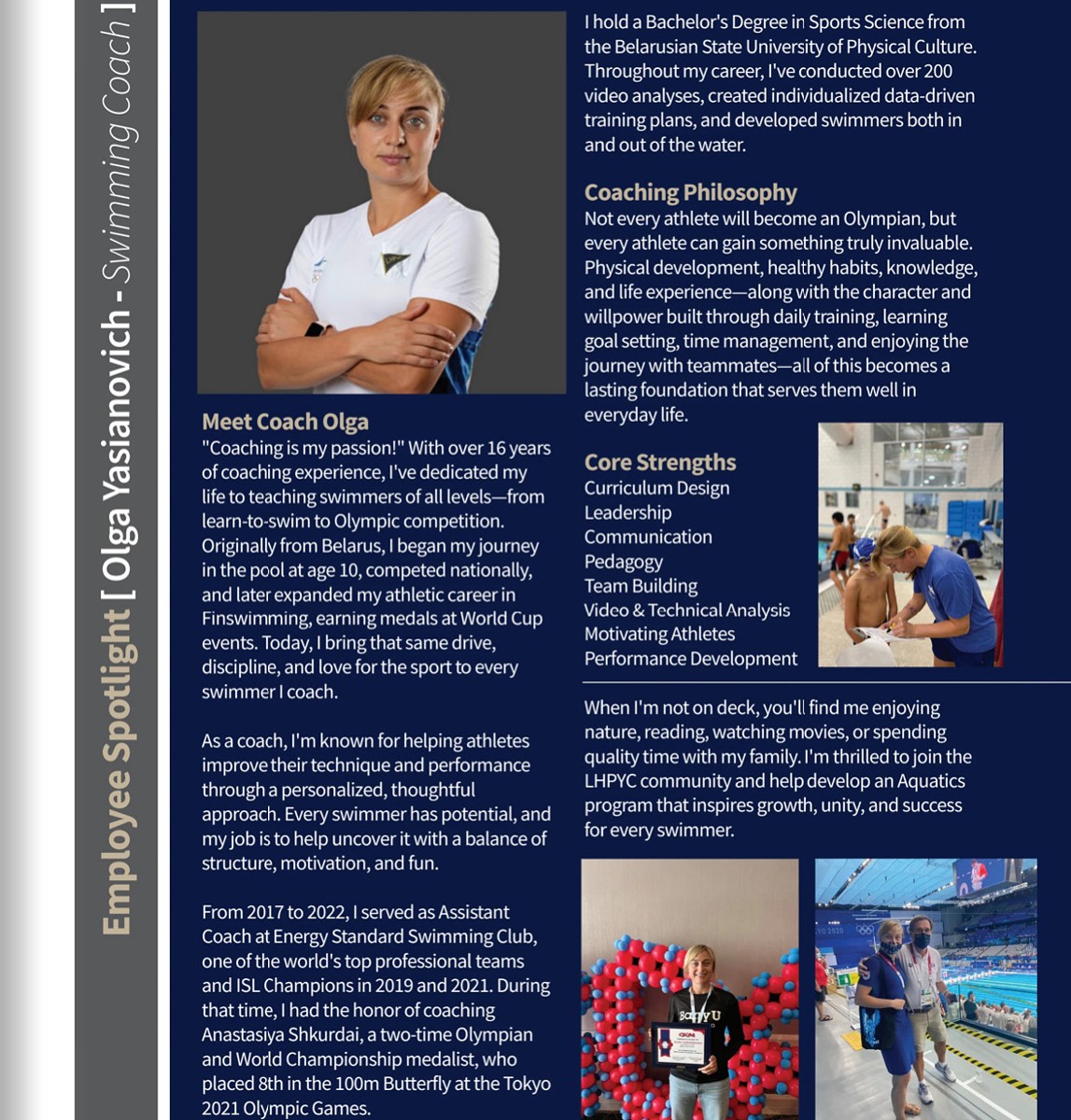Please join us in welcoming Coach Olga to the LHPYC community—we are confident her leadership will inspire growth, teamwork, and success for every swimmer!